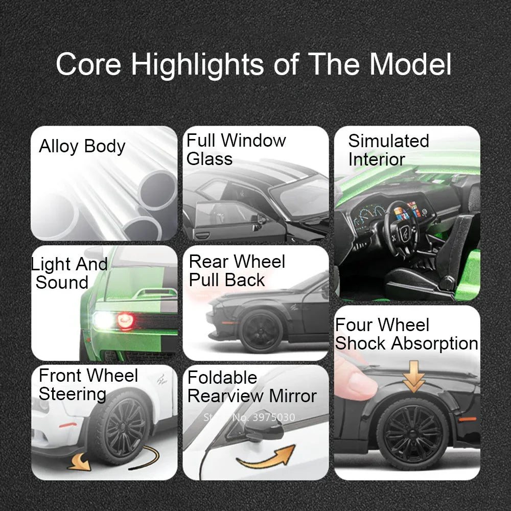🔥 Carrinho de Metal Dodge Challenger SRT Hellcat | Modelo Supercarro com Luz e Som 🔥 Carrinho de Metal Dodge Challenger SRT Hellcat | Modelo Supercarro com Luz e Som