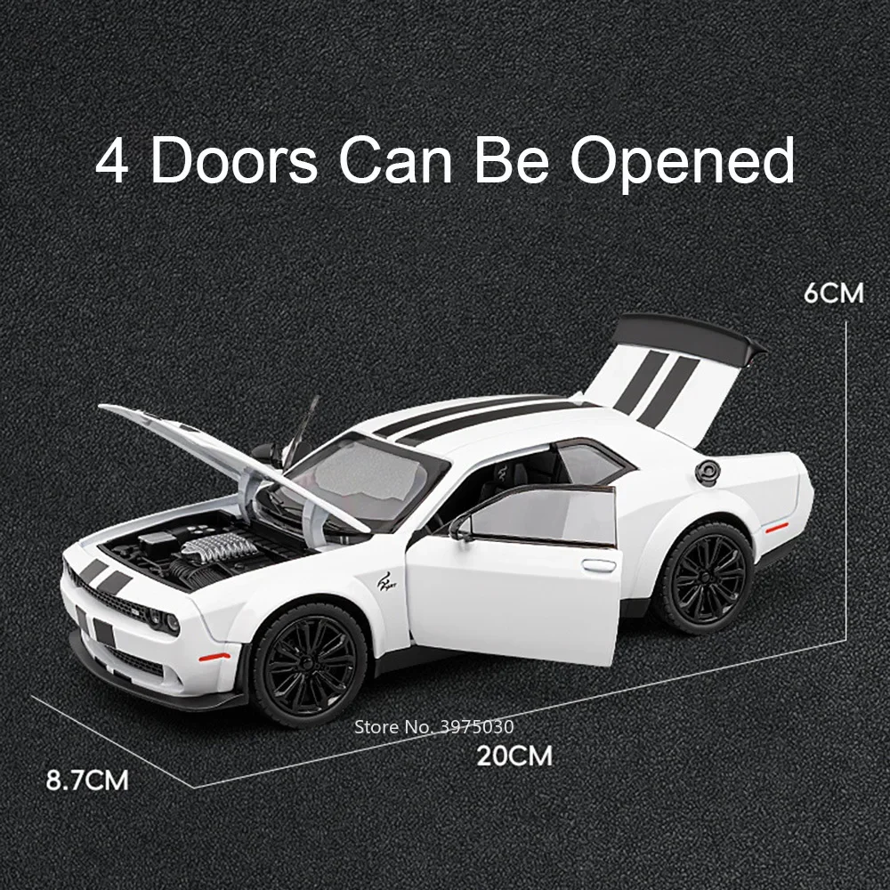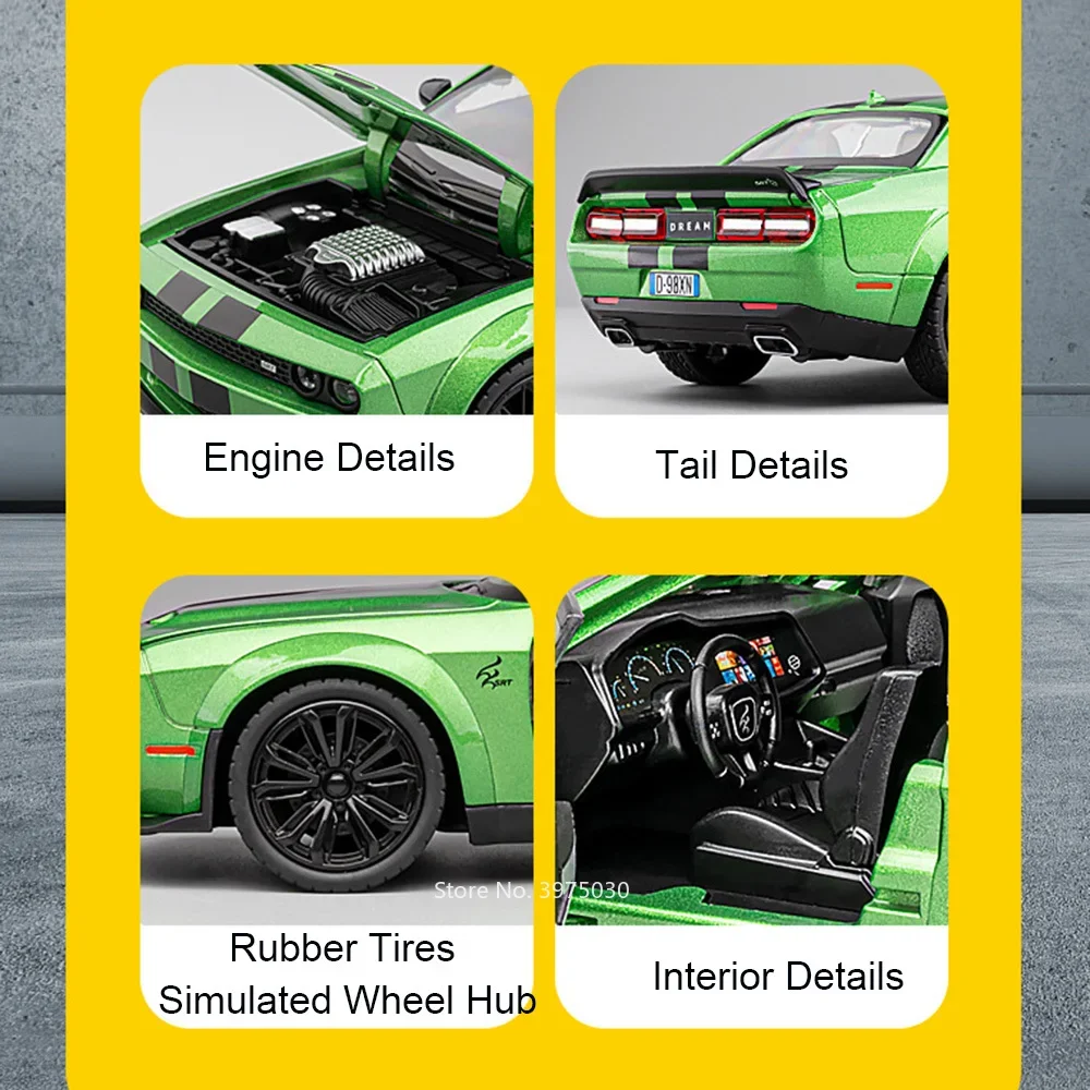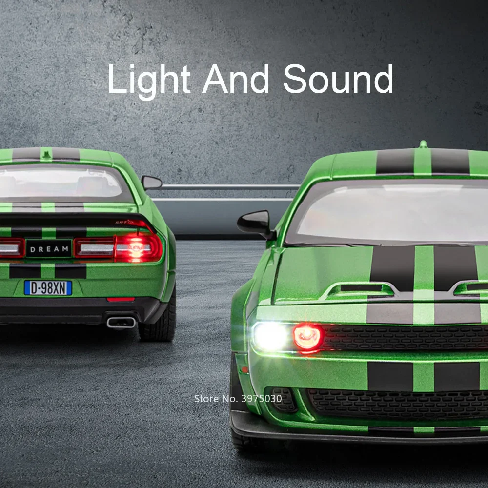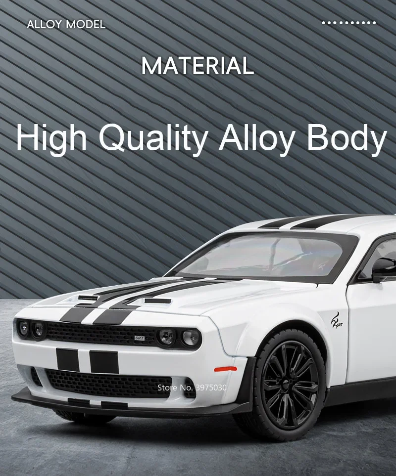 O Dodge Challenger SRT Hellcat 1:22 Ă© feito em liga metĂĄlica (diecast) , com sistema de pull back , luzes e sons realistas que deixam a brincadeira ainda mais emocionante.