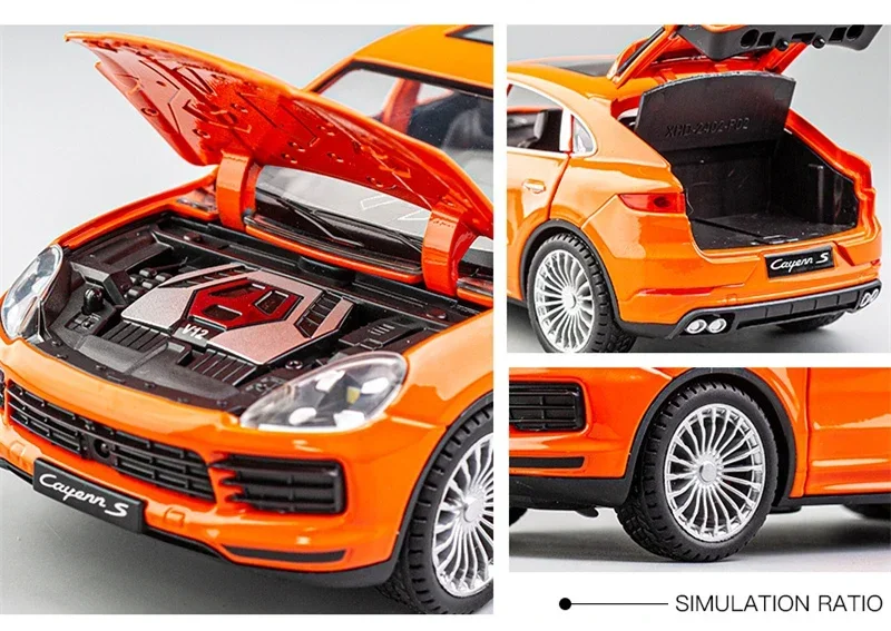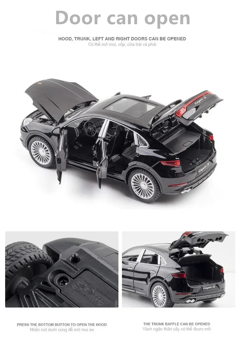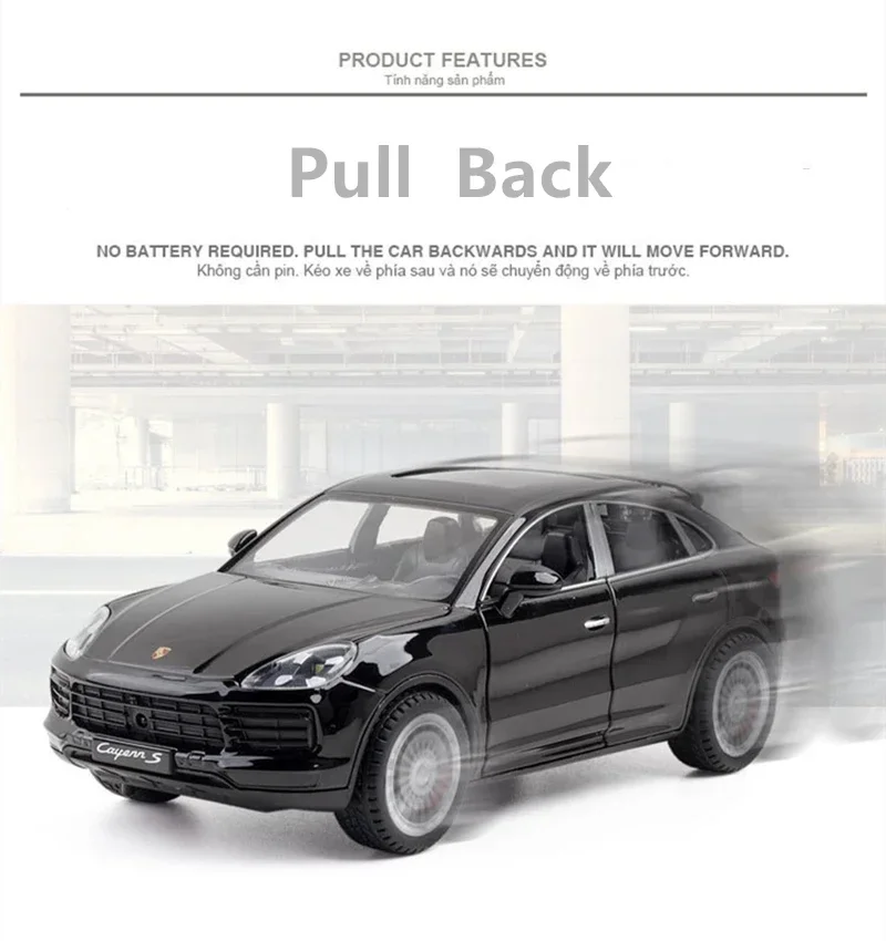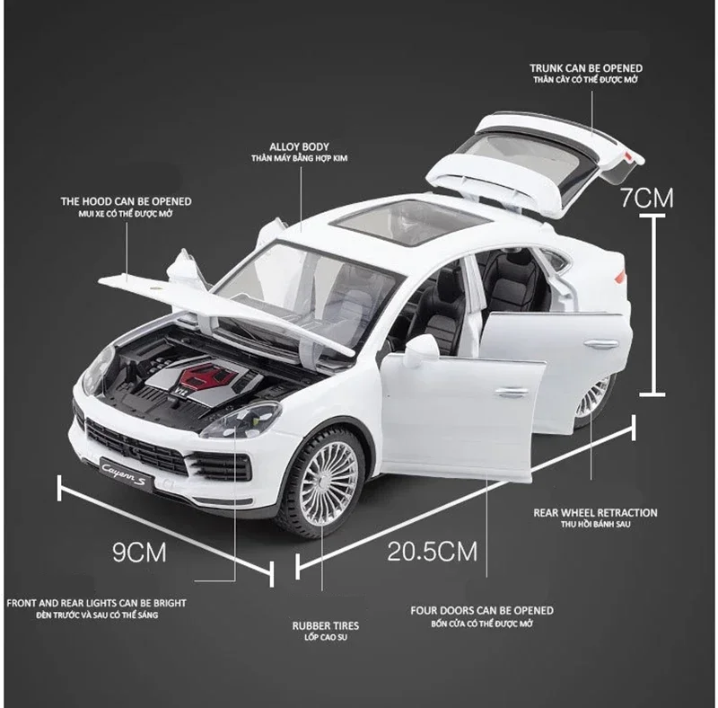 Este modelo em escala 1:24 do Porsche Cayenne Turbo S é uma réplica fiel do SUV específico, feito em liga metálica (diecast) com detalhes impressionantes, efeitos de som e luz e portas que se abrem.